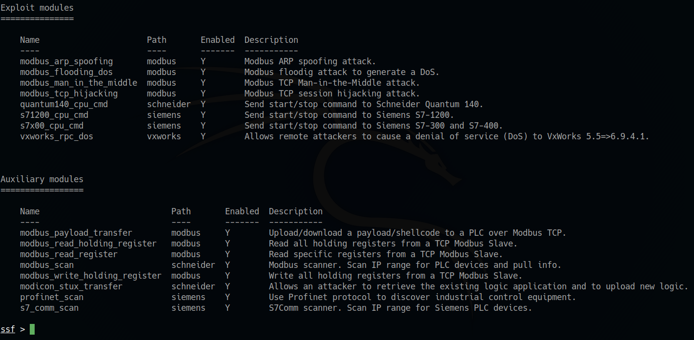Seguendo la stessa filosofia di approccio di Metasploit, anche in SCADAsploit troviamo due categorie di moduli: “auxiliary” ed “exploit”. I moduli ausiliari sono dedicati ad operazioni di ricognizione, scanning, lettura/scrittura di dati ecc., mentre gli exploit basano il loro comportamento sullo sfruttamente di una vulnerabilità.